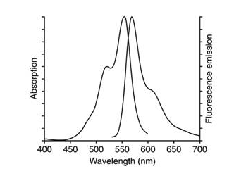 DiI即DiIC18(3),全稱(chēng)為1,1'-dioctadecyl-3,3,3',3'-tetramethylindocarbocyanineperchlorate,是最常用的細(xì)胞膜熒光探針之一,呈現(xiàn)橙紅色熒光。DiI是一種親脂性膜染料,進(jìn)入細(xì)胞膜后可以側(cè)向擴(kuò)散逐漸使整個(gè)細(xì)胞的細(xì)胞膜被染色DiI在進(jìn)入細(xì)胞膜之前熒光非常弱,僅當(dāng)進(jìn)入到細(xì)胞膜后才可以被激發(fā)出很強(qiáng)的熒光。DiI被激發(fā)后可以發(fā)出橙紅色的熒光,DiI和磷酯雙層膜結(jié)合后的激發(fā)光譜和發(fā)射光譜參考下圖1。其中,最大激發(fā)波長(zhǎng)為549nm,最大發(fā)射波長(zhǎng)為565nm。