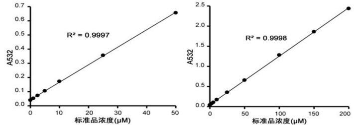 c.水浴冷卻至室溫,1000g室溫離心10分鐘。取200微升上清加入到96孔板中,隨后用酶標(biāo)儀在532nm測定吸光度。如果不方便測定532nm的吸光度,也可以測定530-540nm之間的吸光度??梢栽O(shè)定450nm為參考波長進行雙波長測定。