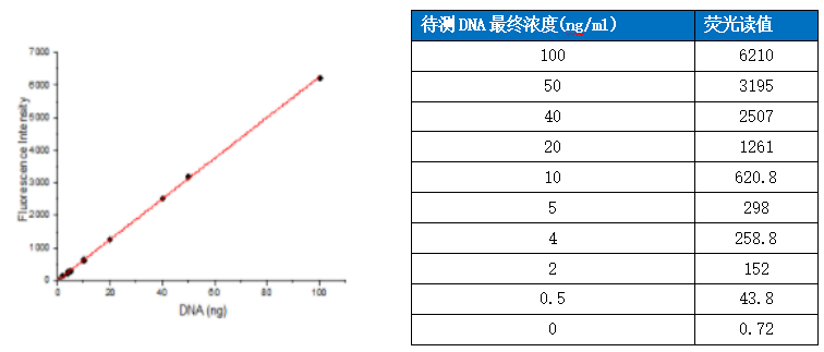 檢測(cè)原理:與DNA雙鏈結(jié)合后才發(fā)出的熒光,無DNA不發(fā)熒光;所發(fā)熒光與DNA濃度成正比。Green定量DNA的方法檢出限約0.3ng/ml,DNA含量在1.25-80ng/mL范圍時(shí)線性較好(R2>0.99).