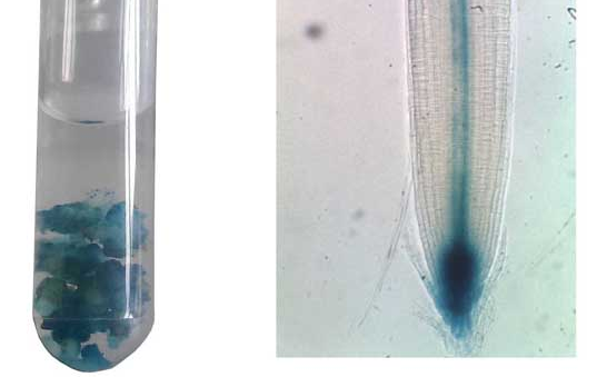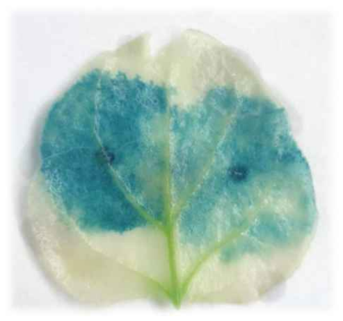 3.洗脫:將材料轉(zhuǎn)入無水乙醇或80%丙酮中脫色2-3次,至陰性對照材料為白色。GUS染色陽性的藍色斑點很穩(wěn)定,在酒精中不褪色。