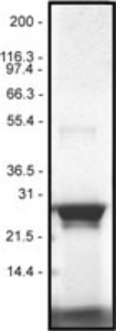 Figure 1: His-RhoA(Q63L) protein purity determination. A 10 μg sample of R6101 (His-RhoA(Q63L) molecular weight approx. 25 kDa) was separated by electrophoresis in a 12% SDS-PAGE system, and stained with Coomassie Blue.