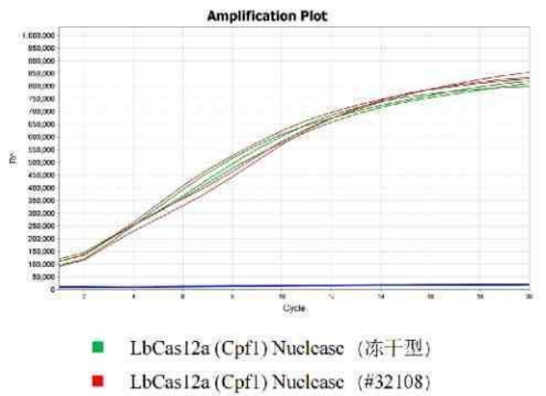 本產(chǎn)品將無甘油LbCas12a核酸酶凍干,可用于常溫運輸及保存,使用配套的凍干Cas酶復(fù)溶液復(fù)溶后,具有與本公司非凍干型LbCas12a (Cpf1) Nuclease(#32108)同等的反應(yīng)活性。本產(chǎn)品包括可用于單個反應(yīng)的酶凍干粉及凍干球等多種凍干形態(tài),滿足不同下游反應(yīng)體系構(gòu)建的需求。