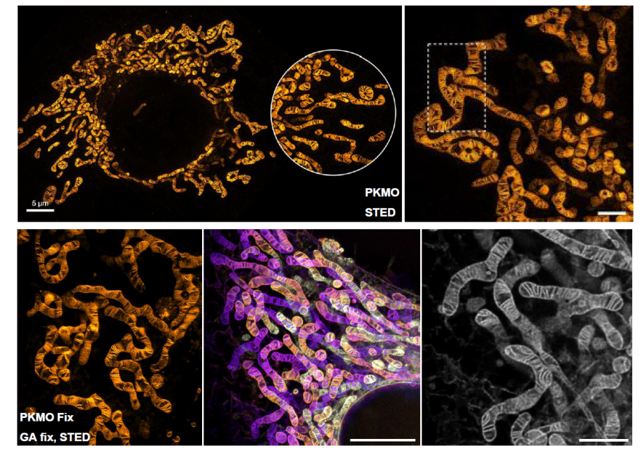 PKMITO??系列的Red、Orange?及Deep Red 具有非常低的化學(xué)毒性、光學(xué)毒性和優(yōu)秀的線粒體定位能力,適用于活細(xì)胞線粒體成像。除此之外,此系列產(chǎn)品也已經(jīng)在斑馬魚等小動物實驗中用于線粒體成像。PKMO FX 在細(xì)胞經(jīng)醛類固定液固定后依然有高的線粒體熒光保留,適用于固定細(xì)胞線粒體成像。綜合這些優(yōu)異的性能,PKMITO??系列產(chǎn)品非常適合用于多種場景下的線粒體成像,尤其在SIM?和STED 等超分辨成像和細(xì)胞分選等領(lǐng)域。