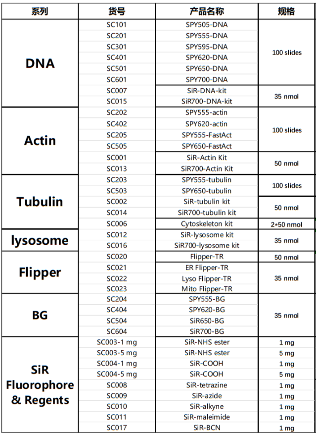 Spirochrome公司開發(fā)的活細胞成像探針是可滲透細胞的化合物,可染色活細胞中的微管(SiR-Tubulin)、F-actin (SiR-Actin)、溶酶體(SiR-Lysosome)和染色體DNA (SiRDNA)。還可提供:下一代活細胞SPYTM探針,膜張力FLIPPER TR探針,以及spirochrometm的bg-substrate。