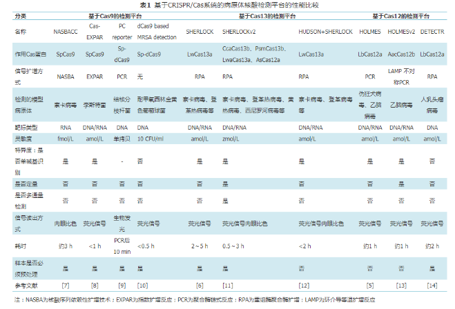 2019年,James課題組提出了一種對(duì)傳統(tǒng)材料進(jìn)行分子編程后用于生物傳感的策略。他們將Cas12a-gRNA復(fù)合物嵌入連有單鏈DNA的晶格結(jié)構(gòu)中制成水凝膠[15]。當(dāng)水凝膠系統(tǒng)暴露于靶標(biāo)DNA存在的環(huán)境中時(shí),Cas12a被激活,其對(duì)周圍單鏈DNA的反式切割使得水凝膠的骨架被剪切破壞,從而造成水凝膠的塌陷。在生物傳感方面,用此策略檢測了葡萄球菌的mecA基因片段,激活的Cas12剪切將淬滅熒光基團(tuán)連接于凝膠骨架的單鏈DNA,導(dǎo)致熒光信號(hào)產(chǎn)生。他們還將水凝膠嵌入微流控紙質(zhì)設(shè)備中,開發(fā)了一種可以對(duì)埃博拉病毒進(jìn)行實(shí)施快速檢測的試紙條,這種試紙條在實(shí)戰(zhàn)中表現(xiàn)出相當(dāng)好的靈敏度和可重復(fù)性。新穎的組合方式使得老材料用了新用法,這種創(chuàng)新的思路可以催生更多新穎的生物傳感策略[16]。表1比較了上述具有代表性的基于CRISPR/Cas系統(tǒng)的病原體檢測分子診斷平臺(tái)的性能。