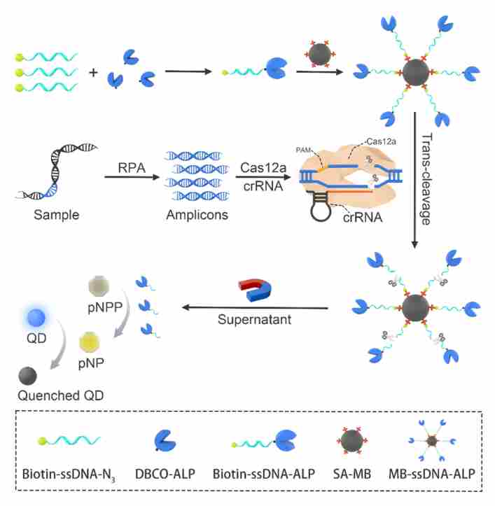本研究開發(fā)了一種結(jié)合RPA、CRISPR/Cas12a和磁珠-酶新型報告系統(tǒng),用于ASFV基因的快速精準(zhǔn)診斷的方法。如圖1所示,biotin-ssDNA-azide與DBCO修飾的堿性磷酸酶(ALP)通過點擊化學(xué)反應(yīng)合成biotin-ssDNA-ALP,biotin-ssDNA-ALP與鏈霉親和素修飾的磁珠(SA-MB)結(jié)合獲得MB-ssDNA-ALP報告系統(tǒng)。用RPA擴(kuò)增ASFV基因序列,獲得擴(kuò)增子,擴(kuò)增子與Cas12a-crRNA復(fù)合物結(jié)合,激活Cas12a反式切割活性,切割MB-ssDNA-ALP上的ssDNA,釋放ALP;ALP催化pNPP水解生成pNP,引起比色信號變化,再加入量子點作為熒光報告子,實現(xiàn)比色和熒光的雙模式信號輸出。