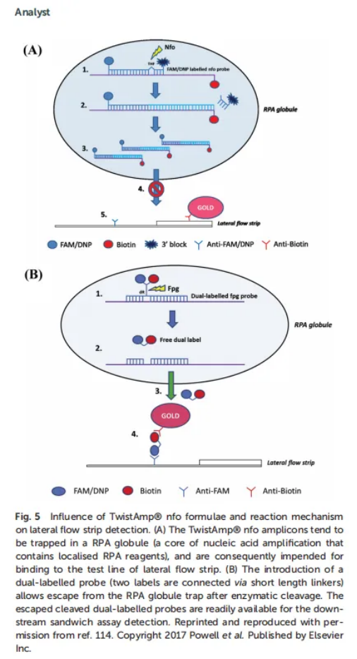 上述問題考慮了RPA反應(yīng)前和反應(yīng)時的條件。此外,反應(yīng)后處理流程對于成功檢測RPA信號至關(guān)重要,應(yīng)根據(jù)RPA擴增子的預(yù)期用途來確定。RPA擴增子的產(chǎn)生依賴于RPA反應(yīng)試劑盒。使用TwistAmp?Basic試劑盒(也稱為Basic RT試劑盒)從正向和反向引物中產(chǎn)生單個擴增子。相反,使用TwistAmp?exo試劑盒(也包括exo RT試劑盒)和TwistAmp?fpg試劑盒不會產(chǎn)生單個擴增子,前者是由于反應(yīng)混合物中存在的外切酶在RPA反應(yīng)中消化了大部分?jǐn)U增子42,后者是由于糖基化酶/裂解酶大腸桿菌fpg裂解產(chǎn)生不可擴展的3 ' -磷酸基(參見第2.3節(jié))46,然而,對于TwistAmp?nfo試劑盒,由于DNA聚合酶對探針引物模板的置換活性,產(chǎn)生了兩種類型的擴增子:雙標(biāo)記擴增子作為探針和其中一種引物的短產(chǎn)物出現(xiàn),而單標(biāo)記擴增子作為正引物和反向引物的長產(chǎn)物出現(xiàn)(圖3C)(注意,在基于夾心法的橫向流條檢測的測試區(qū)域中,只有雙標(biāo)記產(chǎn)物會產(chǎn)生陽性信號)105 - 108。