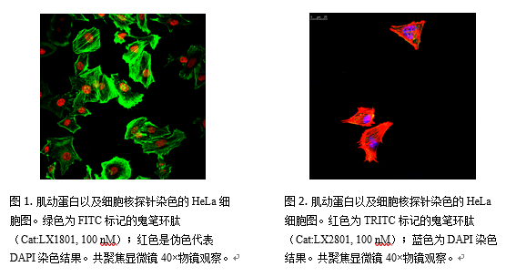 鬼筆環(huán)肽是從毒蕈類(lèi)鬼筆鵝膏(Amanita phalloides)中得到的有毒環(huán)狀七肽,它的作用與細(xì)胞松弛素B恰好相反, 只與聚合的微絲結(jié)合, 而不與肌動(dòng)蛋白單體分子結(jié)合。鬼筆環(huán)肽通過(guò)與聚合的微絲結(jié)合, 抑制了微絲的解體, 破壞了微絲的聚合和解聚的動(dòng)態(tài)平衡。用FITC和Rhodamin等熒光物質(zhì)標(biāo)記的鬼筆環(huán)肽可特異的與真核細(xì)胞的F-actin結(jié)合,從而顯示微絲骨架在細(xì)胞中的分布。