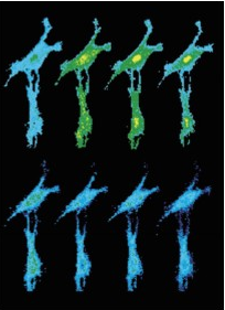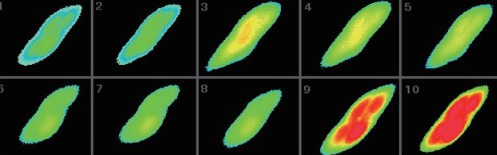 上圖是以9秒間隔連續(xù)拍攝而成。該細(xì)胞首先用50 mM KCl去極化處理 (2),然后用離子載體ionomycin 5 uM處理 (8)。該照片由熒光顯微鏡成像,再由冷CCD拍照而成。后期處理將濃度差異轉(zhuǎn)化為顏色差異,紅色表示高濃度鈣離子,藍(lán)色表示低濃度鈣離子。