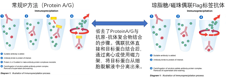與使用Protein A/G瓊脂糖的傳統(tǒng)免疫沉淀(IP)方法相比,Abmart的瓊脂糖/磁珠偶聯(lián)標(biāo)簽抗體,省去了Protein A/G與抗原-抗體復(fù)合物結(jié)合的步驟。偶聯(lián)抗體直接和目標(biāo)蛋白結(jié)合后,通過(guò)離心或使用磁力架,將目標(biāo)蛋白從細(xì)胞裂解液中分離出來(lái)。不僅讓實(shí)驗(yàn)變得簡(jiǎn)單快捷,更可以避免非特異性結(jié)合,降低背景。表位標(biāo)記蛋白的免疫沉淀可用于確定蛋白的細(xì)胞定位、研究翻譯后修飾或檢測(cè)標(biāo)記蛋白與其它蛋白之間的相互作用。