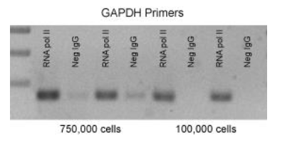 用1%的甲醛固定Hela細(xì)胞10分鐘,使用超聲法破碎染色質(zhì),使用陰性對(duì)照IgG和RNA pol II抗體,對(duì)不同細(xì)胞數(shù)量來源(100,000到750,000個(gè)細(xì)胞)的染色質(zhì)進(jìn)行ChIP,重復(fù)2次。使用陽(yáng)性對(duì)照引物GAPDH對(duì)ChIP后的DNA進(jìn)行36個(gè)循環(huán)的PCR分析(抗體和引物包含在人ChIP-IT對(duì)照試劑盒里,Active motif也可以提供小鼠和大鼠對(duì)照試劑盒)。取10ul PCR產(chǎn)物進(jìn)行1%凝膠電泳,EB染色后紫外觀察。結(jié)果顯示與使用陰性對(duì)照IgG相比,使用RNA pol II抗體的ChIP大量富集了GAPDH啟動(dòng)子區(qū)域的DNA序列。