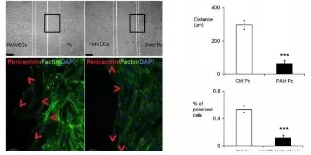 由圖可見(jiàn),相對(duì)于左側(cè)的對(duì)照,右邊的PAH來(lái)源的Pericytes遷移距離較短,并且從熒光標(biāo)記圖上可見(jiàn),紅色箭頭表示遷移的方向,PAH組無(wú)特定方向,不受PMVEC的影響。柱狀圖為統(tǒng)計(jì)結(jié)果。