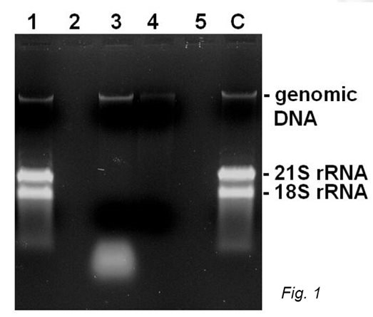 將干燥的RNase A放入反應(yīng)管的樣品1、3和4。然后,RNase A 樣品用1ml的 H2O(3,4) 或RNase-ExitusPlus? (1)處理,室溫下放置5分鐘。緊接著用1ml的無(wú)菌水清洗兩次。然后在每個(gè)管子里放入從大腸桿菌得到的RNA 5ug。將10ug的新鮮分裝RNase A添加到管4中,所有管在37° c孵育30分鐘。5ug未處理的從大腸桿菌得到的RNA作為對(duì)照(C)。最后,加入緩沖液和將樣本加入 1%瓊脂糖凝膠電泳檢測(cè)。