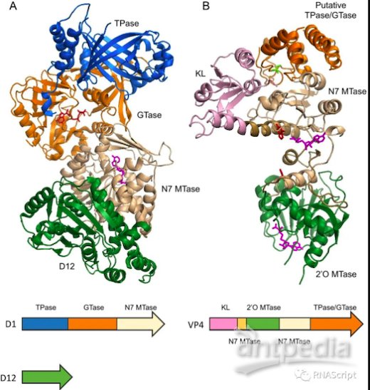 一些病毒加帽酶整合了RNA加帽所有必要酶活性(多功能加帽酶),以在單個多肽中生成Cap0或Cap1。痘病毒加帽酶和藍舌病病毒加帽酶就是這樣兩個例子,它們的全長蛋白質(zhì)結(jié)構(gòu)已經(jīng)被解析(圖4):