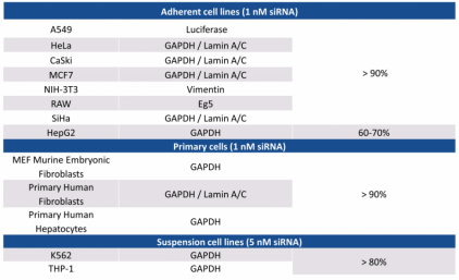 對(duì)多數(shù)貼壁細(xì)胞或原代細(xì)胞,1 nM siRNA能夠達(dá)到超過(guò)90%的基因沉默。對(duì)于懸浮細(xì)胞,使用5 nM siRNA依然能達(dá)到80%的沉默效率。