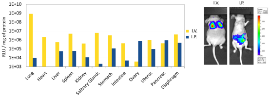 in vivo-jetPEI? 可在任何器官或組織中,通過(guò)基因過(guò)表達(dá)或者基因抑制的方法進(jìn)行基因功能研究。它可以通過(guò)全身和局部注射目標(biāo)多種器官。注射途徑在很大程度上決定了靶器官。例如,在靜脈注射時(shí), in vivo-jetPEI?遞送的 DNA 主要在肺部表達(dá),也在肝臟、胰腺、腎臟、脾臟、膀胱、心臟和動(dòng)脈中表達(dá)。而腹腔注射,基因在卵巢、胰腺、膈肌、子宮和胃中表達(dá) (Fig. 1)。為了實(shí)現(xiàn)器官特異性基因表達(dá),可以結(jié)合細(xì)胞特異性啟動(dòng)子和局部注射途徑,達(dá)到在特定器官/組織中的基因表達(dá)。