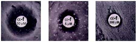 α-因子活性測定。α因子肽信息素(10 μl)作用于MATa細(xì)胞草坪上的無菌過濾器,分別為野生型BAR1 (200 μM,右)pro挑逗或BAR1 Δ (50 μM,左;5μM,中心)。敏感的α-因子明顯表現(xiàn)為清理區(qū)(G1逮捕了細(xì)胞)。BAR1蛋白酶缺失的細(xì)胞對α-因子的活性比bar -1蛋白酶陽性的野生株高需要多20 - 50倍的信息素來阻止細(xì)胞。 |