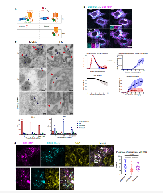 這項工作旨在確定含有不同四跨膜蛋白的 EV 的實際外泌體或外泌體性質(zhì)。為了確定這些細胞釋放的 EV 的亞細胞起源,研究者通過時間控制的方式跟蹤四跨膜蛋白的細胞內(nèi)運輸,從它們在內(nèi)質(zhì)網(wǎng) (ER) 中的初始合成到它們在 EV 中的分泌。研究結果表明,CD63和CD9都可以在質(zhì)膜形成的小ectosomes中釋放,并且在HeLa細胞中,外泌體代表小EVs(sEVs) 的一個小亞群,它們攜帶CD63和其他晚期內(nèi)體分子,如LAMP1/2。它們的分泌特別容易受到內(nèi)體pH值的中和。BSG和SLC3A2被鑒定為HeLa細胞中ectosomes分泌的特定標記物,相反對內(nèi)體pH中和不敏感。有趣的是,CD81是另一種常用作外泌體和/或小EV標記物的四跨膜蛋白,其行為類似于CD9而不是CD63。此處確定的外泌體與ectosomes的特異性標志物和分子機制將為進一步研究以破譯它們各自的功能鋪平道路。