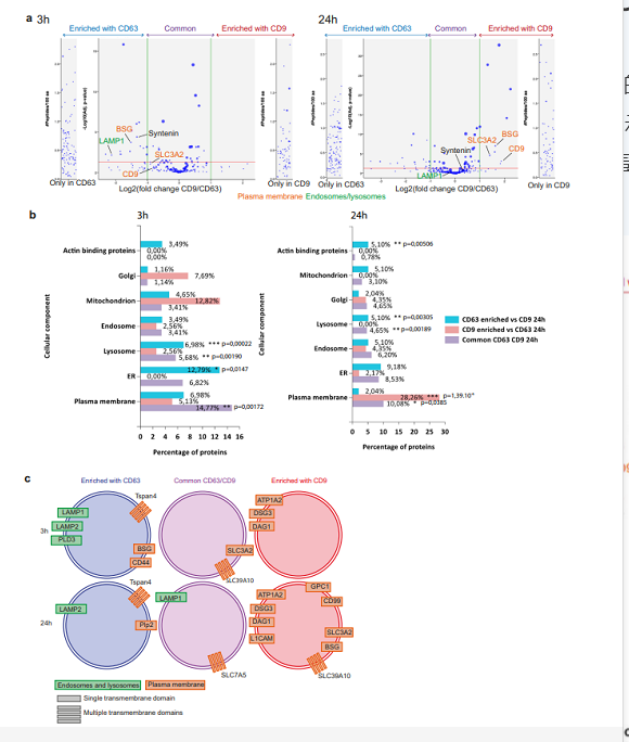為了更好地確定CD63 +和CD9 + EV的起源,并鑒定PM或內(nèi)體釋放的EV的特定標志物,研究者進行了定量質(zhì)譜分析;同步分泌的 CD63 或 CD9 EV 的定量質(zhì)譜分析揭示了質(zhì)膜和內(nèi)體衍生的 EV 的特征,PM 蛋白在 CD9-EV 中富集,而內(nèi)體/溶酶體和 PM 跨膜蛋白都在 CD63-EV 中富集。