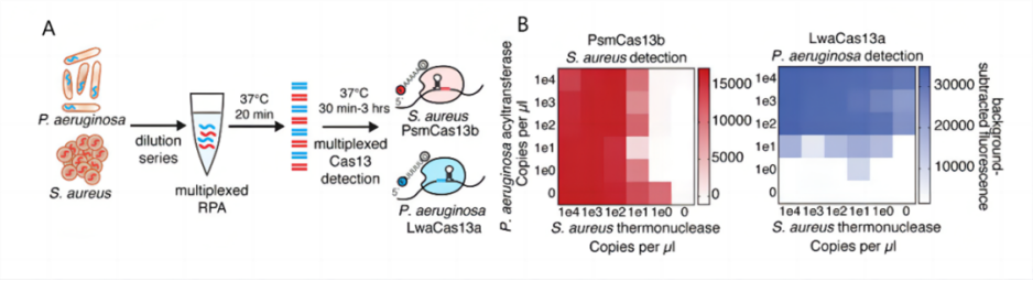 Gootenberg[8]等基于重組酶聚合酶擴(kuò)增技術(shù) (Recombinase Polymerase Amplification, RPA)和CRISPR/Cas13建立了RPA-CRISPR/Cas-雙重?zé)晒鈾z測系統(tǒng)。通過多重RPA擴(kuò)增,再將擴(kuò)增產(chǎn)物轉(zhuǎn)錄得到RNA靶標(biāo),兩種不同的RNA靶標(biāo)分別與Cas13a/crRNA、Cas13b/crRNA結(jié)合并激活對應(yīng)Cas13蛋白的反式剪切活性。根據(jù)Cas13蛋白反式剪切探針的偏好性,采取Cas13a剪切poly U探針,Cas13b剪切poly A探針,兩種探針分別標(biāo)記不同的熒光基團(tuán),從而通過檢測兩種熒光信號強(qiáng)度的變化,實現(xiàn)對金黃色葡萄球菌和銅綠假單胞菌的同時檢測。