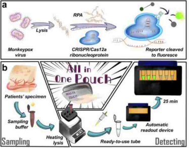 近日,一項發(fā)表于《Sensors and Actuators B: Chemical》的研究介紹了一款特殊的猴痘病毒檢測裝置,該裝置包含了以RPA和CRISPR-Cas12a技術(shù)作為原理的凍干型檢測試劑,可在35分鐘內(nèi)完成對猴痘病毒的快速自測。