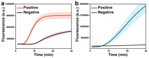 研究人員選取了猴痘病毒的B6R和F3L基因作為檢測的靶標(biāo),并針對這兩個基因篩選了多對RPA引物。盡管如此,在對模擬樣本進(jìn)行獨(dú)立RPA擴(kuò)增測試的過程中仍出現(xiàn)了較多的非特異性擴(kuò)增,這與RPA方法的擴(kuò)增原理相關(guān)。為了解決檢測過程中非特異性擴(kuò)增的問題,研究人員嘗試將CRISPR-Cas12a核酸檢測技術(shù)與RPA方法相結(jié)合,并分析相同的樣品。結(jié)果證明該方法使檢測的特異性得到了明顯的提升,CRISPR-Cas12a識別了RPA擴(kuò)增子的特定序列,并將其與非特異性擴(kuò)增的產(chǎn)物區(qū)分開來(圖2)。