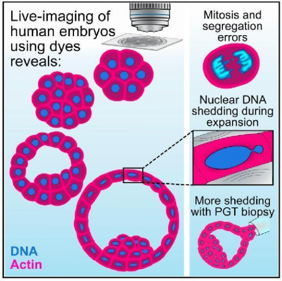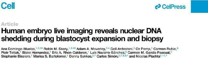 2023年7月5日,美國(guó)賓夕法尼亞大學(xué)Nicolas Plachta研究組與Igenomix基金會(huì)Carlos Simon以及波士頓IVF-Eugin研究組合作在Cell上發(fā)表了文章Human embryo live imaging reveals nuclear DNA shedding during blastocyst expansion and biopsy,通過(guò)結(jié)合熒光染料以及實(shí)時(shí)活體成像揭示人類(lèi)胚體發(fā)育過(guò)程以及染色體分離動(dòng)力學(xué)特征,同時(shí)發(fā)現(xiàn)了人類(lèi)胚胎非整倍體的出現(xiàn)源自于染色體分離的錯(cuò)誤以及核DNA脫落。