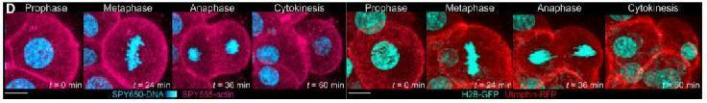 為了創(chuàng)建無(wú)侵入性活體成像,作者們首先在活體胚胎植入前嘗試可透性的熒光染料,其中SPY650-DNA可以用于標(biāo)記基因組DNA,而SPY55-actin用于標(biāo)記肌動(dòng)蛋白,兩種熒光標(biāo)記具有很高的信噪比。此外,細(xì)胞周期持續(xù)時(shí)間、發(fā)育時(shí)間以及囊胚進(jìn)展在熒光染料染色與未染色的胚胎中結(jié)果相似。這些結(jié)果說(shuō)明了SPY650-DNA以及SPY55-actin可透性染料用于活體成像的無(wú)害性。另外,兩種染色染色的結(jié)果與顯微注射組蛋白H2B mRNA H2B-GFP以及肌動(dòng)蛋白Utr-RFP所得到的標(biāo)記結(jié)果類(lèi)似(圖1)。因而通過(guò)使用高通透性染料作者們實(shí)現(xiàn)了避免遺傳操作進(jìn)行活體胚胎成像的目標(biāo)。