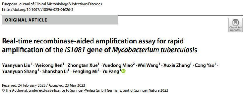 首都醫(yī)科大學(xué)附屬北京胸科醫(yī)院副書記龐宇老師課題組在《European Journal of Clinical Microbiology & Infectious Diseases 》期刊上發(fā)表文章《Real-time recombinase-aided amplifcation assay for rapid amplifcation of the IS1081 gene of Mycobacterium tuberculosis》,影響因子4.5。