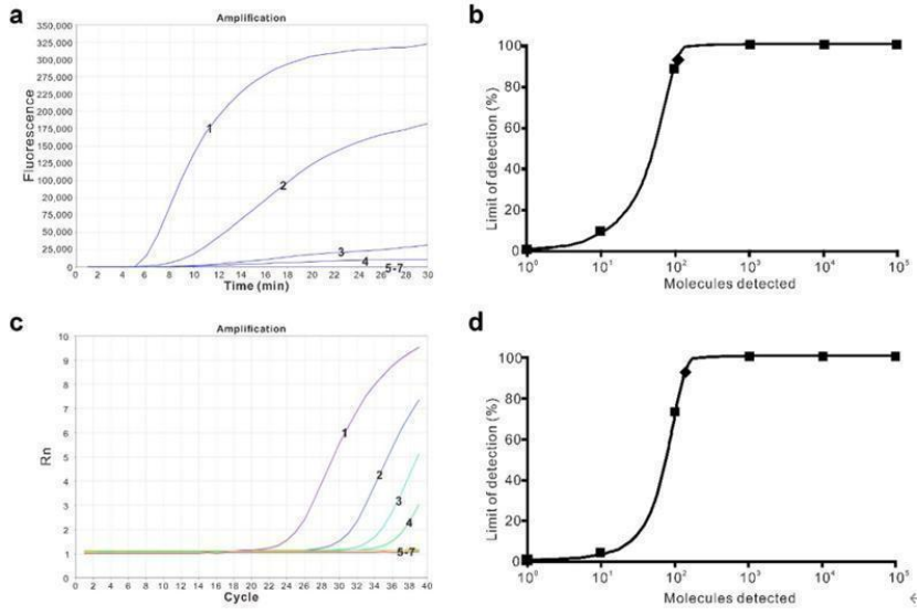 采用含有IS1081基因全長的連續(xù)稀釋重組質(zhì)粒,測定實(shí)時MIRA檢測MTB的靈敏度,并與qPCR進(jìn)行比較。如上圖a和c所示,兩種檢測方法的檢測限均為每反應(yīng)100拷貝。并做了Probit回歸分析,MIRA技術(shù)檢測在95%概率下的擴(kuò)增限為163拷貝,而qPCR的擴(kuò)增限為244拷貝。