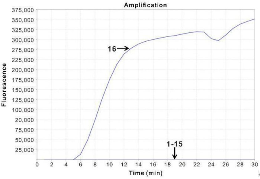 分別對結(jié)核分枝桿菌、膿腫分枝桿菌、膿腫分枝桿菌、異種分枝桿菌、偶然分枝桿菌、龜分枝桿菌、海洋分枝桿菌、恥垢分枝桿菌、豬分枝桿菌等陽性樣本進(jìn)行檢測。結(jié)果只有結(jié)核分枝桿菌呈現(xiàn)陽性,見上圖曲線16。