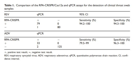 從急性呼吸道感染的兒童中采集咽拭子樣本160例。同時使用MIRA-CRISPR方法、qPCR方法進行檢測,并將結果與臨床試驗結果進行比較。與qPCR方法相比,MIRA-CRISPR方法對RSV和ADV的敏感性分別為98.1%和91.4%,檢測特異性均為100%。Kappa值大于0.95,表明其一致性程度較高。