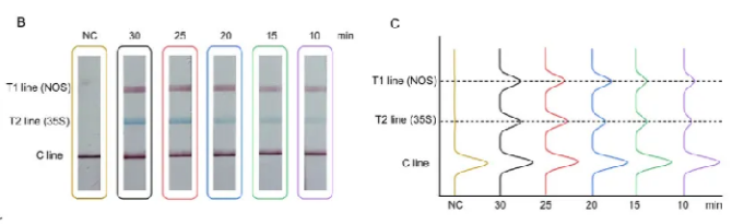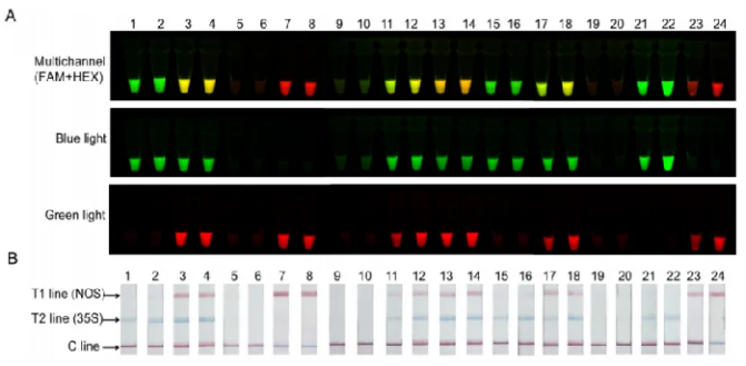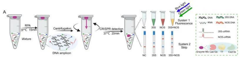 在本研究中,課題組開(kāi)發(fā)了一種新的一鍋法反應(yīng)——雙重MIRA檢測(cè)結(jié)合雙重CRISPR(MR-DCA方法),用于同時(shí)檢測(cè)轉(zhuǎn)基因作物中的CaMV35S和NOS遺傳靶點(diǎn),為轉(zhuǎn)基因作物的檢測(cè)提供了一種簡(jiǎn)單高效的方法。