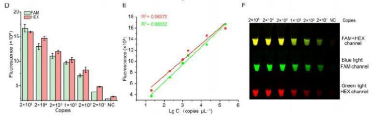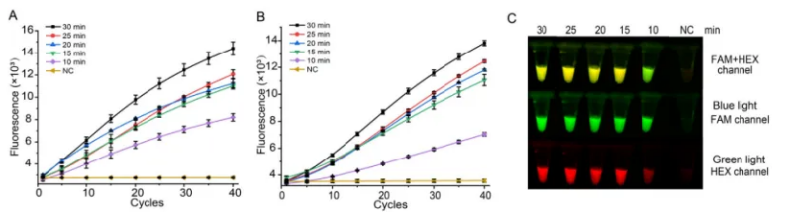 反應(yīng)時(shí)間是現(xiàn)場(chǎng)檢測(cè)的一個(gè)重要因素,課題組觀察到在反應(yīng)時(shí)間為10 min時(shí),就已經(jīng)能用熒光儀檢測(cè)到FAM和HEX的熒光信號(hào)。MIRA結(jié)合CRISPR反應(yīng),也在15min后觀察到黃色熒光。
