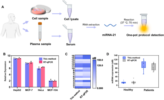 圖6.所示。一鍋法檢測臨床樣品中miRNA的臨床應(yīng)用。(A)使用RT-qPCR和本方法測量的人血漿樣品和細胞樣品中miRNA檢測步驟示意圖。(B) RT-qPCR檢測HepG2、MCF-7、HeLa和MCF-10A細胞系中提取的miRNA-21與該方法在生物傳感中的應(yīng)用比較。(C)使用RT-qPCR和本方法測量的miRNA-21濃度熒光信號水平的熱圖。(D)采用該方法(藍色)和RT-qPCR(黑色)分析患者和健康樣本中miRNA-21的表達水平。數(shù)據(jù)以均數(shù)±標準差表示(n = 3)。