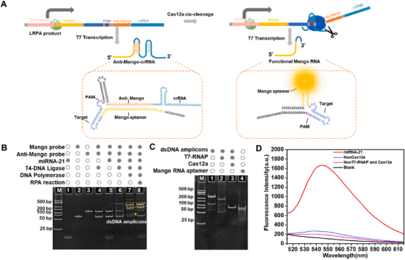 順式切割機制的應(yīng)用:以往的CRISPR/Cas12a診斷方法多依賴于反式切割進行信號放大,但容易導(dǎo)致假陽性。而本文利用Cas12a的順式切割機制,結(jié)合轉(zhuǎn)錄擴增策略,生成功能性Mango RNA,實現(xiàn)了信號輸出,避免了反式切割帶來的假陽性問題。