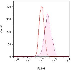 用0.2% DMSO模擬培育Jurkat細(xì)胞或在37℃下用5μM的MG-132過夜培育。用熒光素p62 Ab (1:500稀釋原液)培育細(xì)胞。清洗細(xì)胞后,通過流式細(xì)胞儀在FL1信道使用488nm的激光進(jìn)行分析。在MG132處理的細(xì)胞時(shí),熒光素p62 Ab的抗體信號(hào)增加約2.5倍。 |