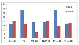 分別使用毒胡蘿卜素(Tg,0.1微米),25,50和75微米氯喹(CQ)處理K562 細(xì)胞24小時(shí),來誘導(dǎo)內(nèi)質(zhì)網(wǎng)應(yīng)激和不完全自噬細(xì)胞。采用陽性對(duì)照,加入蛋白酶體抑制劑,鎂 132 (5 μ M)培育 24小時(shí)。固定并透化沉淀的細(xì)胞。接著根據(jù)說明書的指示,在室溫下用 300 μ l PROTEOSTAT? 聚集小體檢測(cè)試劑盒 (Enzo Life Sciences)培育細(xì)胞30分鐘,加入1 微克/毫升 DAPI (用來測(cè)定細(xì)胞周期)。S值聚集小體小傾向的因子(APF)相對(duì)增加,G1和G2m的S值是通過每次細(xì)胞處理后檢測(cè)的結(jié)果和對(duì)照組相比而得出。S期和G1相比,ER 應(yīng)激誘導(dǎo)劑、Tg和 50 μ M CQ的聚集小體數(shù)量呈上升趨勢(shì),同時(shí)顯示蛋白酶體抑制劑,MG-132和50μMCQ下降的聚集小體數(shù)量在G2M S期比對(duì)照水平更低。Courtesy of the Flow Cytometry Core Facility, Blizard Institute, Queen Mary University of London, London, UK. |