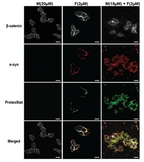 α-syn混合物形式聚集在被內(nèi)化到M17神經(jīng)母細(xì)胞瘤細(xì)胞系的細(xì)胞質(zhì)膜。用α-syn單體處理M17細(xì)胞,聲波處理α-SIGN PFFs或α-SYN混合物(M + F)。四天后,在固定M17細(xì)胞前,將其清洗3次,用 PROTEOSTAT?聚合染料(綠色)染色和用抗α-syn(紅)和β連環(huán)蛋白(灰色)免疫染色。比例尺= 20μm。作者提到“Fibril生長和播種量α-synuclein蛋白介導(dǎo)的細(xì)胞凋亡中發(fā)揮重要作用?!贝藞D來自A-L Mahul-Mellier, et al.; Cell Death & Differentiation (2015). (doi:10.1038/cdd.2015.79). |