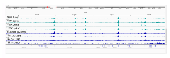 陽性對照試劑(Jurkat細胞顆粒,H3K9ac抗體和對照引物集)包含在低細胞優(yōu)化模塊中,允許用戶在使用任何寶貴的樣本之前熟悉和排除低細胞ChIP-Seq試劑盒。在檢查染色質質量和數(shù)量后,可以對陽性對照樣品進行測序,以確認ChIP-Seq峰如預期出現(xiàn)