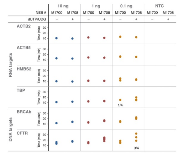 使用 WarmStart 熒光 LAMP/RT-LAMP 2X 預(yù)混液(不含 dUTP/UDG)(NEB #M1700 試劑盒中的組分)和 WarmStart 通用 LAMP/RT-LAMP 2X 預(yù)混液(含 UDG)(NEB #M1708)進(jìn)行 RT-LAMP(RNA 靶標(biāo))或 LAMP(DNA 靶標(biāo))實(shí)驗(yàn)。反應(yīng)加入 1X LAMP 引物和 1X LAMP 熒光染料后,分別加入三個(gè)數(shù)量級(jí)的 Jurkat RNA 或 Jurkat DNA (10 ng-0.1 ng)和無(wú)模板對(duì)照(NTC),每個(gè)樣品做 4 個(gè)重復(fù),形成 25 μl 反應(yīng)體系,置于 96 孔板中 65℃孵育 40 分鐘。使用實(shí)時(shí)熱循環(huán)儀(Bio-Rad? CFX96)中的 SYBR/FAM 通道進(jìn)行 15 秒一次的熒光檢測(cè)。每個(gè)點(diǎn)代表熒光信號(hào)超過(guò)儀器閾值的時(shí)間。除了個(gè)別說(shuō)明外,每個(gè)樣品都檢測(cè)到所有 4 個(gè)重復(fù)(注:如果各重復(fù)的檢測(cè)時(shí)間相似,則檢測(cè)點(diǎn)重疊)。總體而言,各樣品檢測(cè)結(jié)果顯示:NEB #M1700 和 NEB #M1708 性能一致。無(wú)模板對(duì)照均無(wú)擴(kuò)增。