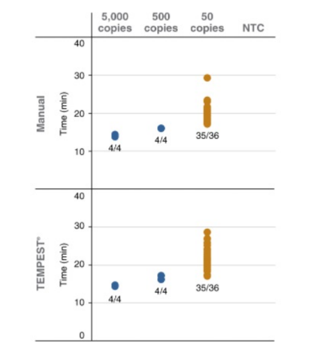 通過(guò)手動(dòng)或 TEMPEST? 自動(dòng)化液體處理工作站(96 孔,25 μl 反應(yīng))建立針對(duì)于合成 SARS-CoV-2 RNA 樣品的 LAMP 檢測(cè)體系。檢測(cè)樣品為:陽(yáng)性樣品(人總 RNA 混入 5,000、500 或 50 拷貝的合成 SARS-CoV-2 RNA)或無(wú)模板對(duì)照(NTCs)。經(jīng) 65℃ 孵育 40 分鐘,使用 1X LAMP 熒光染料在實(shí)時(shí)熒光儀器(Bio-Rad CFX96)中的 SYBR/FAM 通道檢測(cè)。結(jié)果顯示:兩種體系的檢測(cè)時(shí)間和最低檢出限(LOD)結(jié)果一致。