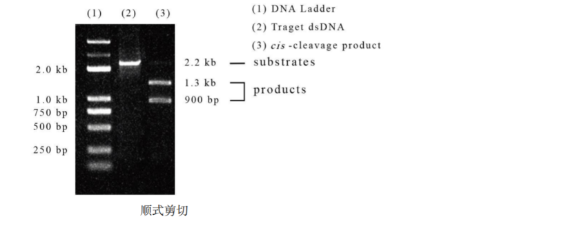 *若用核酸電泳來(lái)分析順式剪切產(chǎn)物,對(duì)于 20 μL 順式剪切應(yīng)體系,推薦 target DNA的使用量為 100 ng~500 ng,且 target DNA片段長(zhǎng)度在 300 bp~3 kb 范圍內(nèi)。不同長(zhǎng)度 target DNA 需要的 Cas 酶和 sgRNA 的量需要根據(jù) target DNA 的摩爾量計(jì)算,建議保持 Cas 酶:sgRNA:target DNA的摩爾比為 10:10:1,以盡量確保 target DNA被剪切完全。