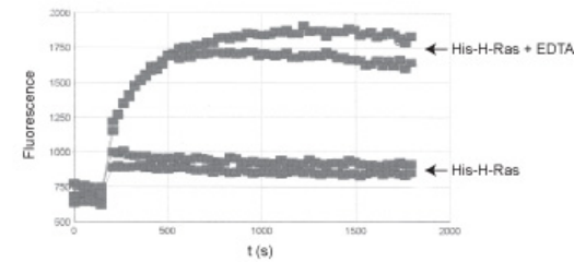 The biological activity of His-H-Ras is determined from its ability to catalyze the exchange of GDP for GTP. EDTA is used to sequester magensium ions from the His-H-Ras protein, thereby stimulating nucleotide exchange activity. The RhoGEF exchange assay Biochem Kit? (Cat. # BK100) is used to monitor the nucleotide exchange in His-H-Ras.