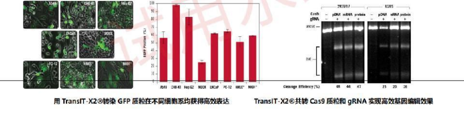 用 TransIT-X2?轉(zhuǎn)染 GFP 質(zhì)粒在不同細胞系均獲得高效表達 TransIT-X2?共轉(zhuǎn) Cas9 質(zhì)粒和 gRNA 實現(xiàn)高效基因編輯效果