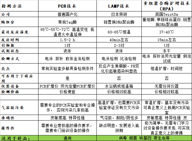 常規(guī)PCR,環(huán)介導(dǎo)的恒溫PCR(LAMP),重組酶聚合酶擴(kuò)增(RPA)三種分子擴(kuò)增技術(shù)原理和對(duì)比