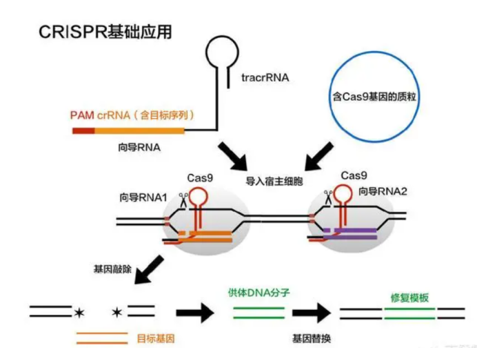 Cas9是一種DNA內切酶,Cas9內切酶必須在向導RNA分子的引導下對DNA進行切割,這是因為這些向導RNA分子含有與靶DNA序列互補的序列,稱之為PAM序列。Cas9蛋白精確的平端切割位點位于PAM上游3個核苷酸位置,形成平末端產物。Cas9蛋白的HNH結構域負責切割與crRNA互補配對的那一條DNA鏈,而RuvC結構域負責切割另外一條非互補DNA鏈。最終在Cas9的作用下DNA雙鏈斷裂(DSB)形成雙鏈DNA缺口,然后細胞會借助同源重組機制(homologous recombination)或者非同源末端連接機制(non-homologous end joining)對斷裂的DNA進行修復,進而實現DNA片段的敲除或敲入。