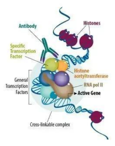 在活細胞狀態(tài)下,當用甲醛處理時,相互靠近的蛋白與蛋白、蛋白與核酸(DNA或RNA)之間會產生共價鍵。細胞內,當TF與Promoter相互結合時,它們必然靠的比較近或者契合在一起,這個時候用甲醛處理,能使它們之間產生共價鍵。固定的蛋白質-DNA復合物通過超聲或酶處理將其隨機切斷為一定長度范圍內的染色質小片段,然后通過抗原抗體的特異性識別反應沉淀此復合體,特異性地富集目的蛋白結合的DNA片段,通過對目的片斷的純化與檢測,從而獲得蛋白質與DNA相互作用的信息。通過qPCR或二代測序,篩選與目的蛋白互作的未知DNA信息。