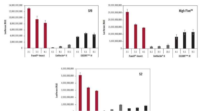 圖2. TransIT®-Insect的性能優(yōu)于競爭對手的轉(zhuǎn)染試劑。昆蟲細胞系(A)Sf9,(B)High Five™, 和(C)果蠅S2細胞,在96孔板中用0.1µg由hr5增強子/IE1啟動子驅(qū)動的熒光素酶表達質(zhì)粒進行轉(zhuǎn)染,使用指定試劑以指定試劑與DNA的比例(µl:µg)轉(zhuǎn)染。在轉(zhuǎn)染后48小時測量螢光素酶的表達。Sf9和High Five™在無血