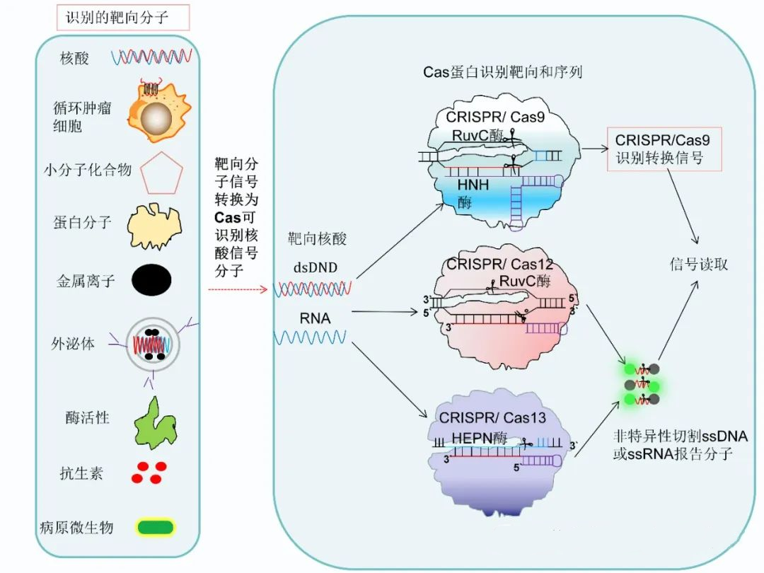 CRISPR/Cas系統(tǒng)在引導RNA(guide RNA,gRNA)的引導下識別目標核酸(DNA/RNA)序列后,激活Cas蛋白對靶向和非靶向核酸(DNA/RNA)分子切割。CRISPR/Cas系統(tǒng)在靶向識別和切割過程中轉(zhuǎn)化靶標核酸分子信號為檢測儀器或肉眼可觀察的信號。